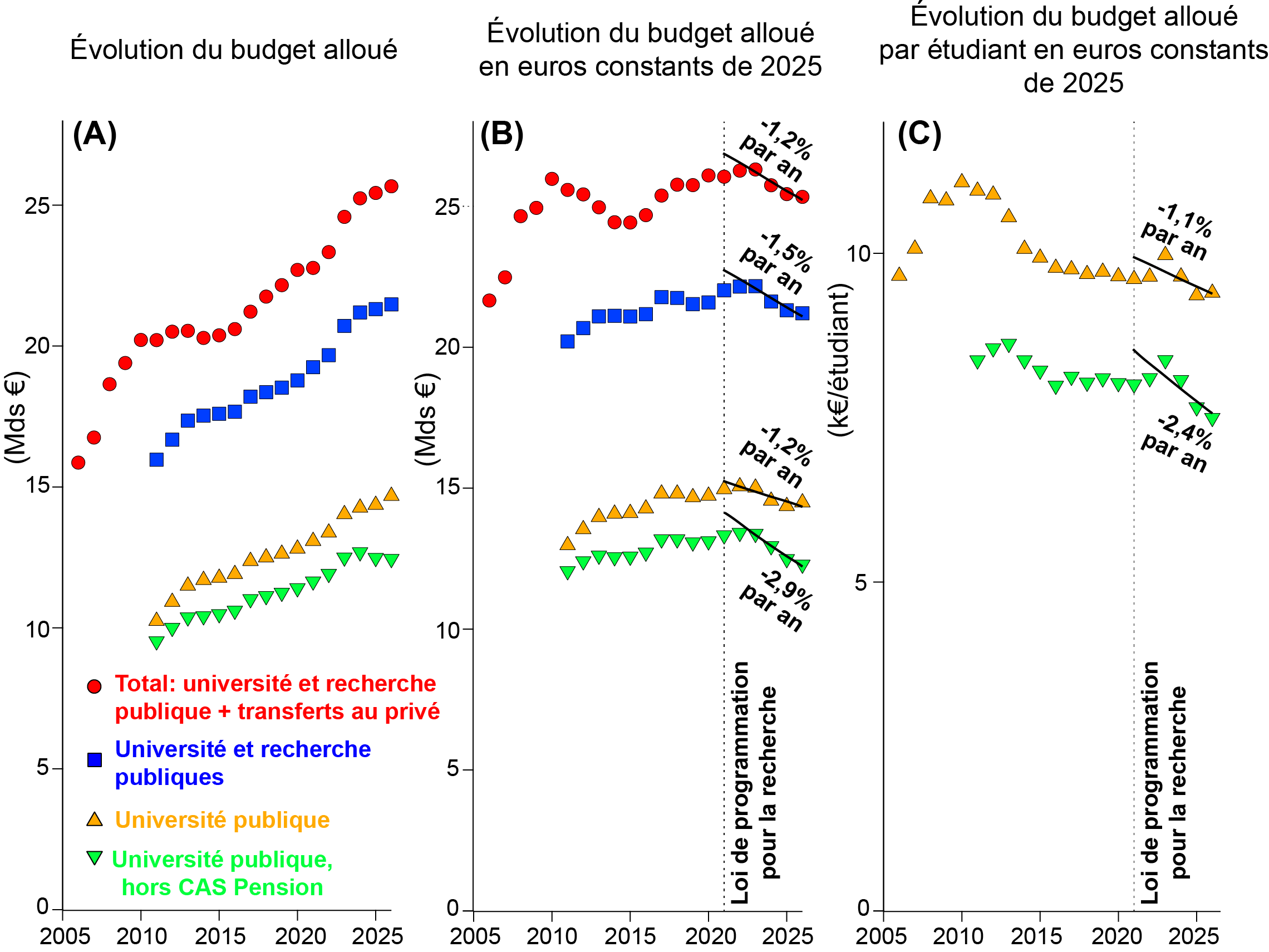 Comme chaque année, nous avons analysé l’évolution des budgets de la recherche et de l’Université à partir des documents budgétaires, résumée par le graphique suivant :