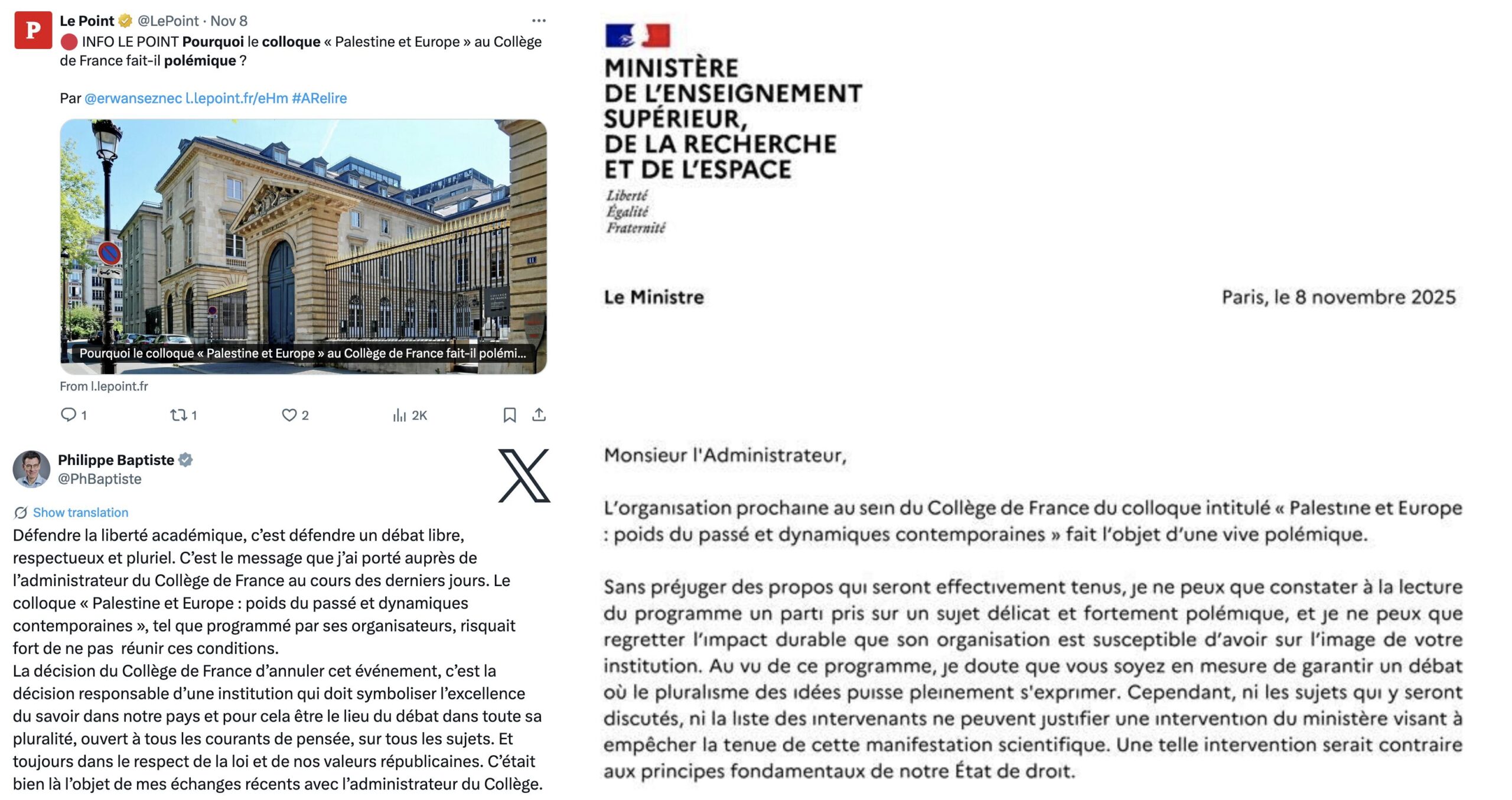 Téléchargez la lettre d’intimidation envoyée par le ministre Baptiste à l’administrateur du Collège de France pour demander la censure du colloque: “la Palestine et l’Europe” : |